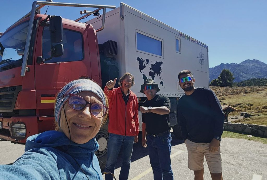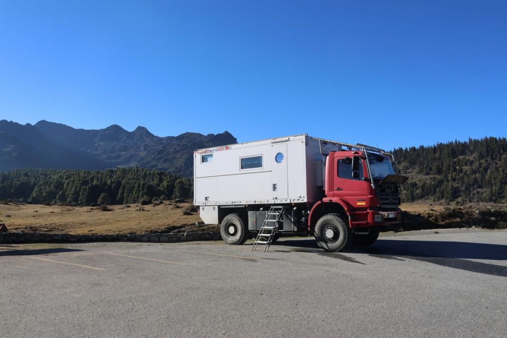 Nun bemerken wir, dass bei Emma das Kühlwasser ausläuft. Andy parkt Emma auf eine Ebene und schaut nach der Ursache. Obwohl nun der vorhergesagte Nebel aufkommt und ich die Emma in 5m Abstand nicht mehr erkenne. Die Schlauchschellen sind locker und eine davon hat sich auch noch während der Reparatur gelöst. Nachdem alle wieder fest sind und auch dicht geworden sind verziehen wir uns ins Innere. Noch ist es in der Emma warm. Doch am nächsten morgen haben wir 15 Grad und aktivieren die Heizung. Doch diese funktioniert nicht. Vermutlich ist zu viel Luft im System. Wir möchten sofort herunterfahren, doch die Emma springt nicht an. 3 Versuche, kein Glück, ihr ist es einfach zu kalt und zu hoch.