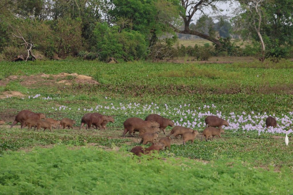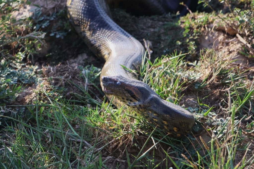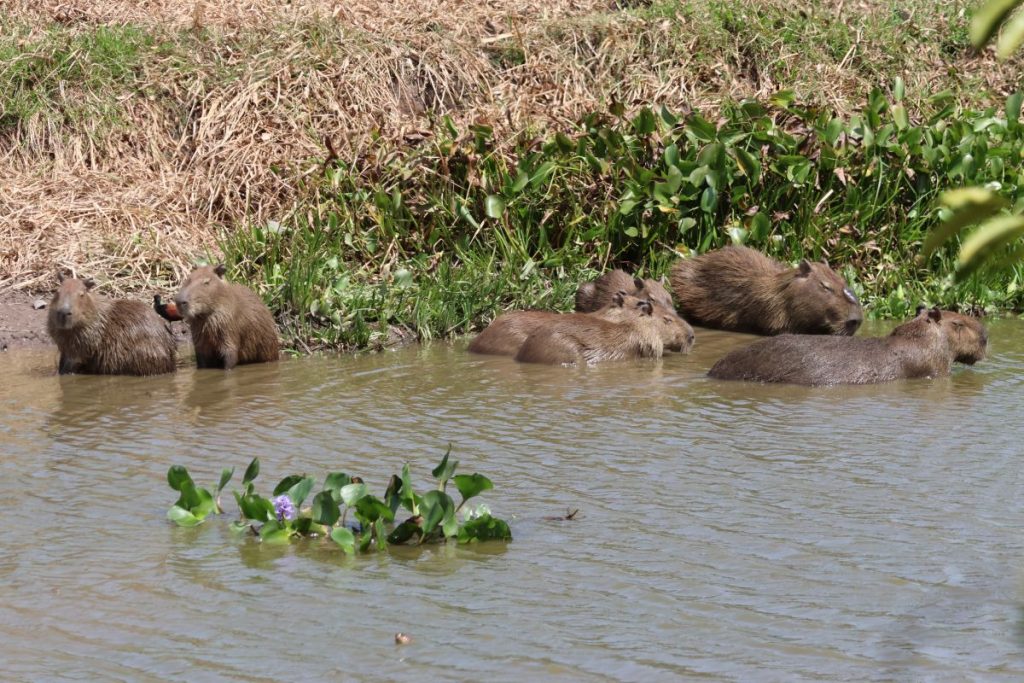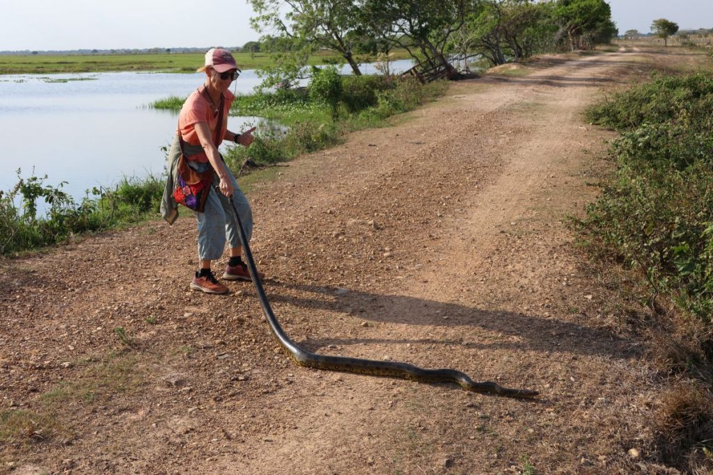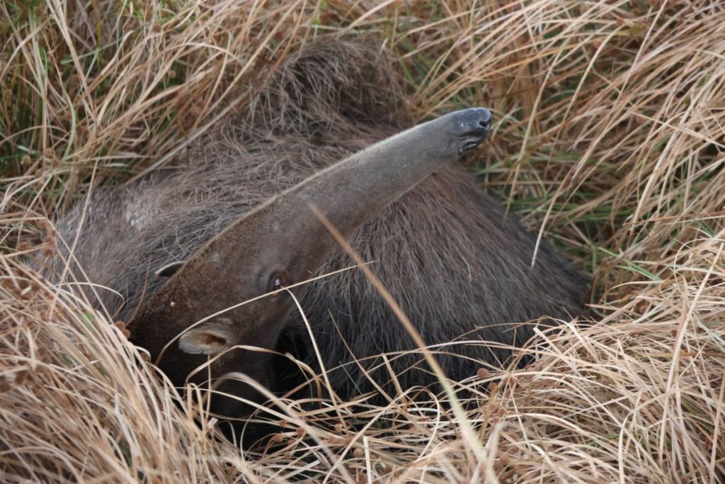 Wir sehen Capybaras, die sich durch das Wasser schieben und sich am Grün genüsslich speisen, während sich Kaimane reglos im Wasser treiben lassen. Plötzlich bleibt unser LKW stehen – in einiger Entfernung bewegt sich etwas durchs hohe Gras. Wir beobachten einen Ameisenbär, der sich einen Schlafplatz sucht. Dann ist er weg. Wir streifen durch das hohe Gras und suchen ihn. Andy findet ihn tatschlich in einer Graskuhle, mit seinem buschigen Schwanz deckt er sich zu. Vermutlich riecht er uns und streckt seine Nase in die Höhe. Dann steht er auf und sucht sich einen anderen Schlafplatz. Endlich haben wir einen Ameisenbär gesehen. Sehr beeindruckend!