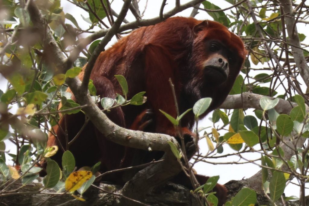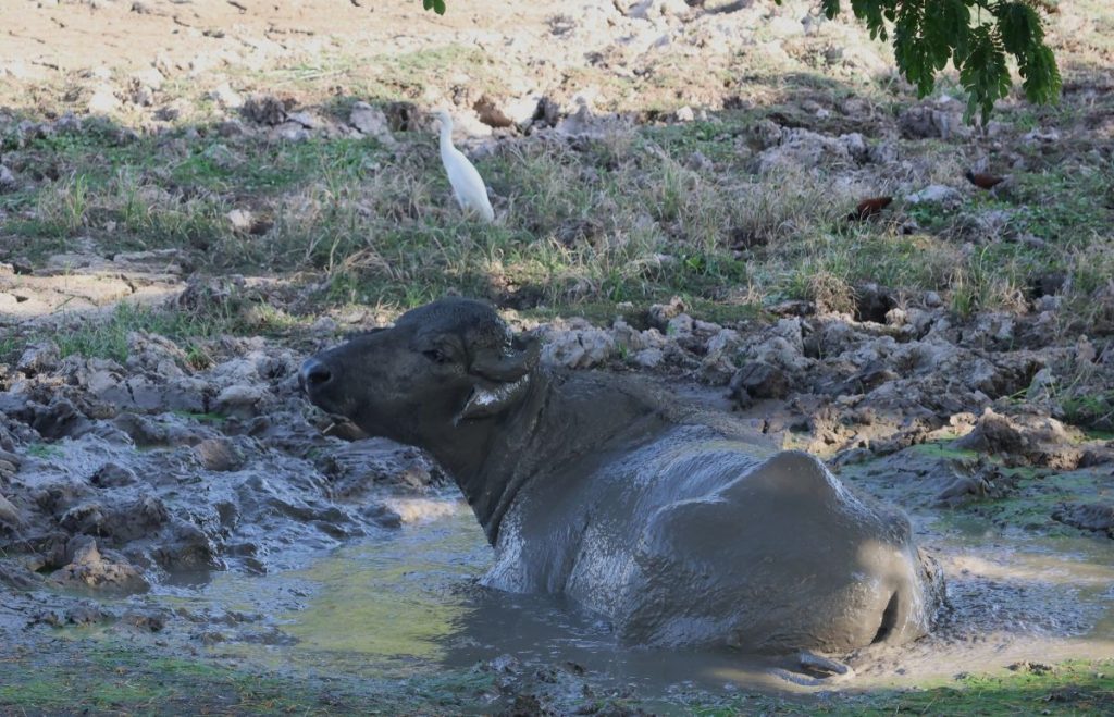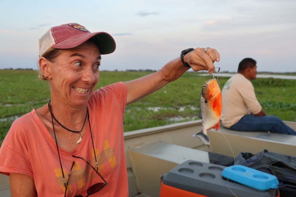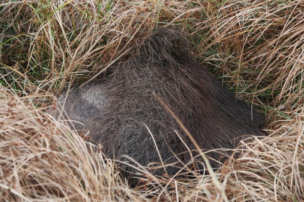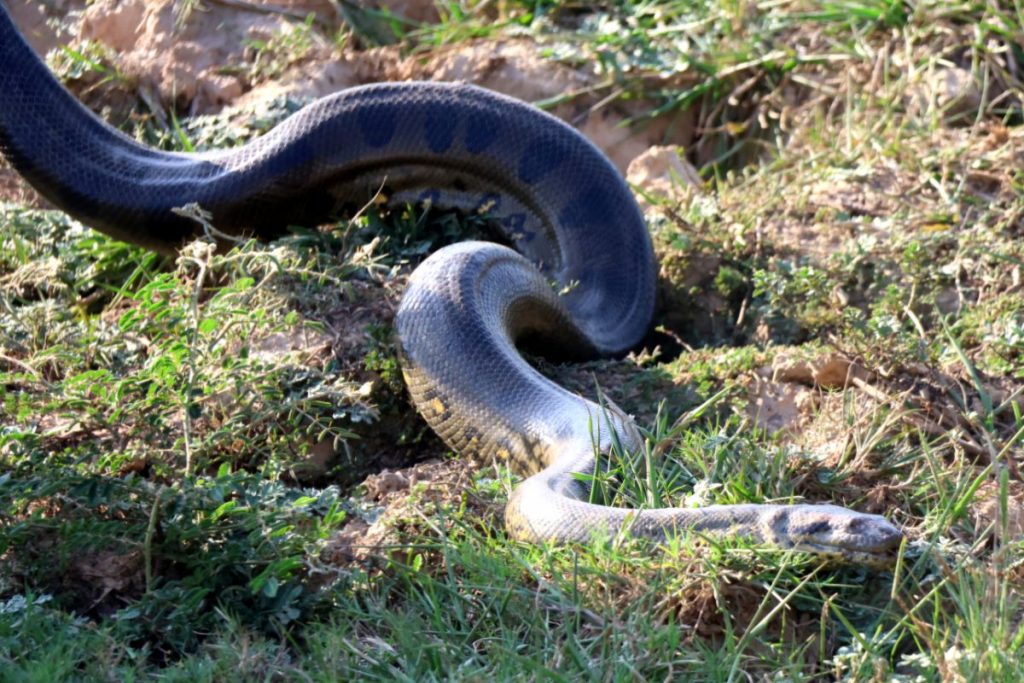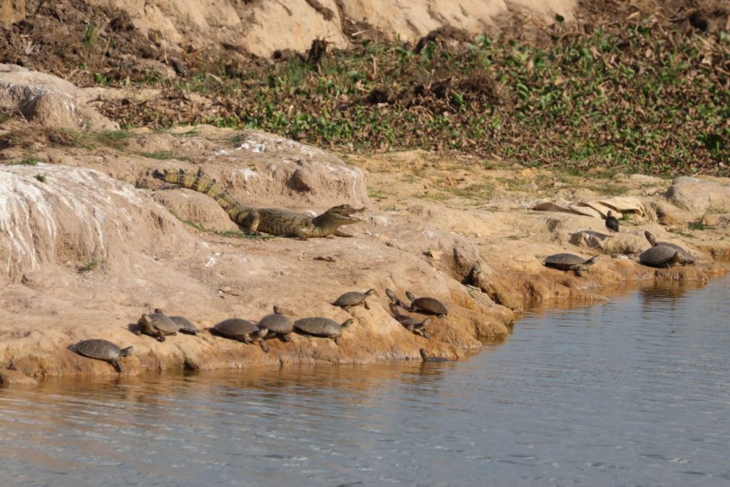 Wir sehen Capybaras, die sich durch das Wasser schieben und sich am Grün genüsslich speisen, während sich Kaimane reglos im Wasser treiben lassen. Plötzlich bleibt unser LKW stehen – in einiger Entfernung bewegt sich etwas durchs hohe Gras. Wir beobachten einen Ameisenbär, der sich einen Schlafplatz sucht. Dann ist er weg. Wir streifen durch das hohe Gras und suchen ihn. Andy findet ihn tatschlich in einer Graskuhle, mit seinem buschigen Schwanz deckt er sich zu. Vermutlich riecht er uns und streckt seine Nase in die Höhe. Dann steht er auf und sucht sich einen anderen Schlafplatz. Endlich haben wir einen Ameisenbär gesehen. Sehr beeindruckend!