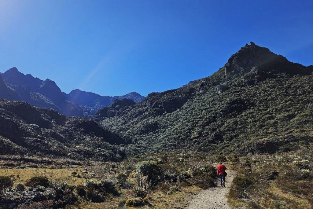 Was diese Gegend so einzigartig macht, ist die Vegetation. Die Landschaft ist übersät mit Espeletien oder Frailejones oder Schopfbäume oder Anden- Sonnenblume wegen der gelben Blüten. Viele Namen für eine Pflanzenart. Es sind samtige, silbergrüne Pflanzen, die wie kleine aufrechtstehende Wächter aussehen und nur in dieser Höhenlage gedeihen. Die Umgebung ist übersät und verleiht der Landschaft einen besonderen Charme.