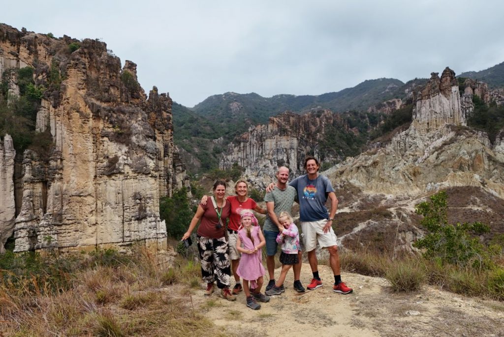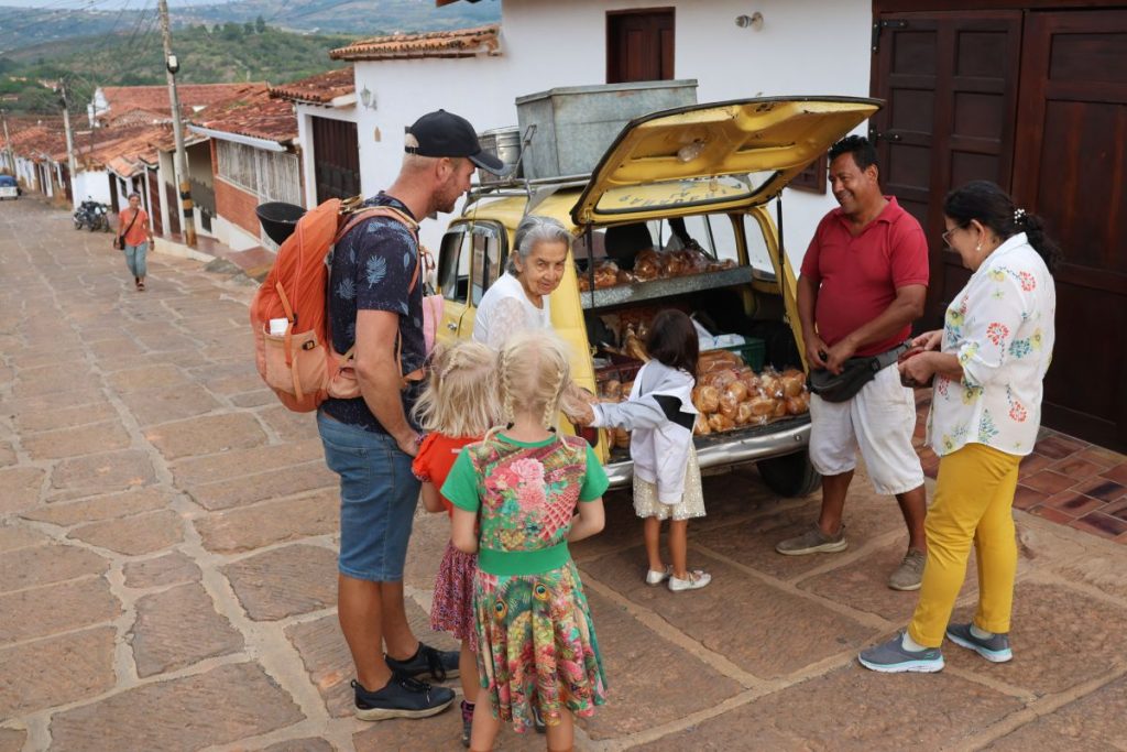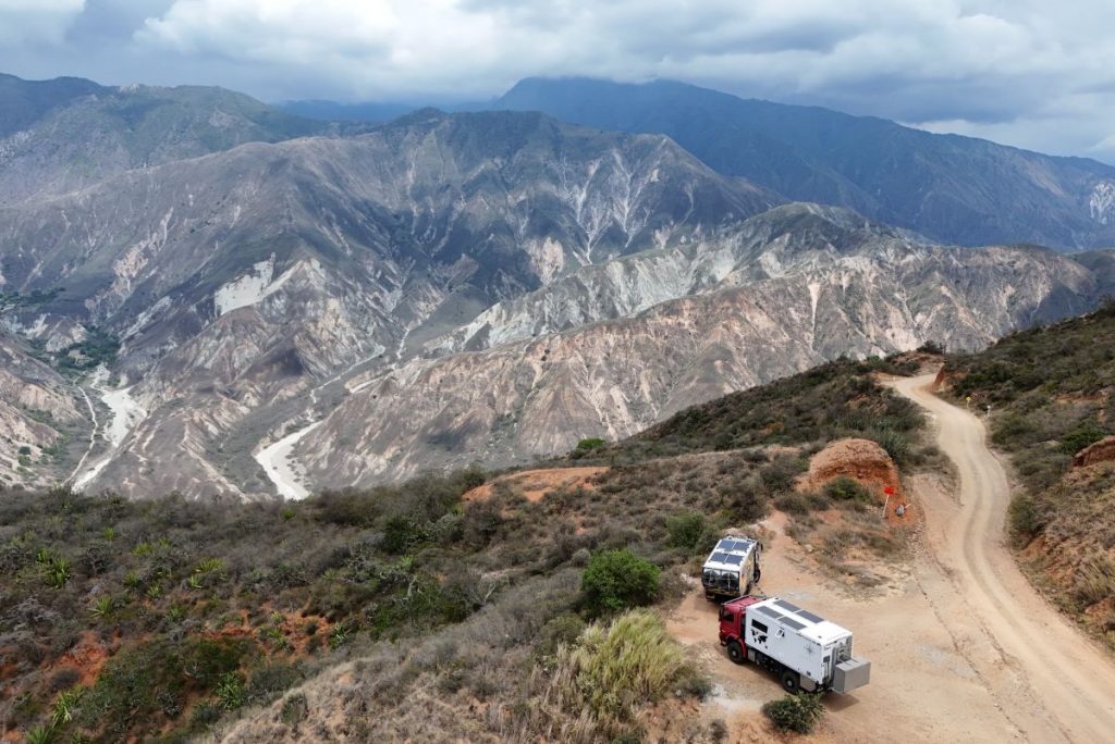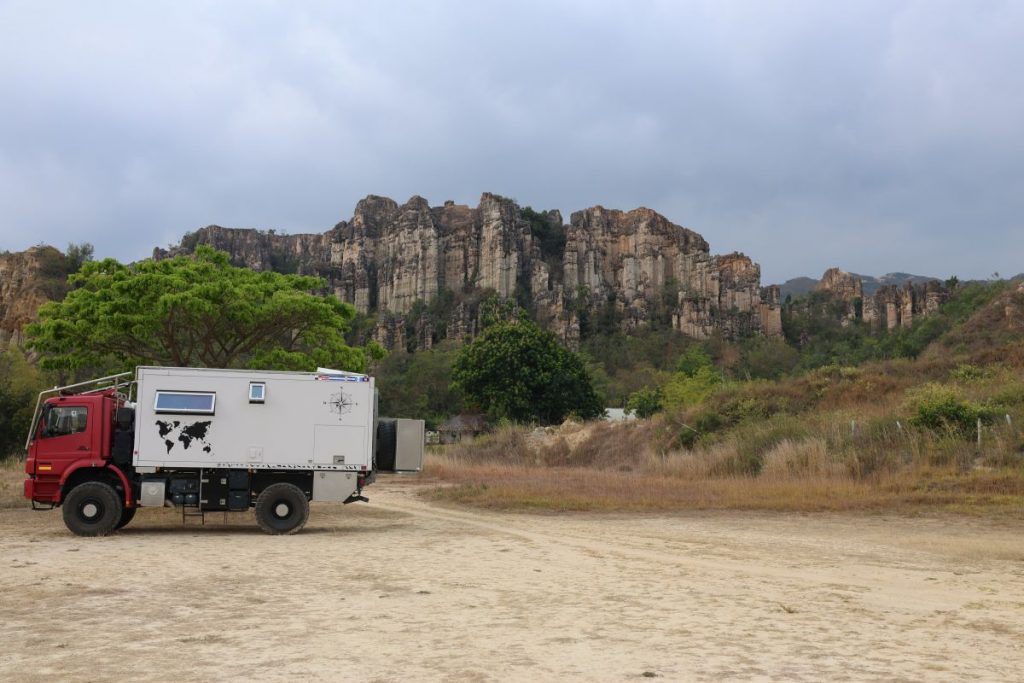 Einer der kleinsten Nationalparks Kolumbiens zieht uns in seinen Bann: Area Natural Unica Los Estoraques hat auf uns sogleich eine besondere Ausstrahlung. Wir richten uns um den Regenbaum ein und erfahren von Campo, dem Platzwart, dass sich an diesem Platz gute energetische Energien befinden, denn es gibt hier viele Mineralien. Wir fühlen uns jedenfalls alle sehr wohl, wandern durch die tolle Landschaft der Hoodoos und Säulen, durch enge Felsspalten in die verlorene Stadt und in die Höhle der Skelette. Einen Dank geht an Eefke für ihre wunderbaren Drohnenbilder, denn diese ist deutlich größer und bei den aktuellen Winden nicht so empfindlich als unsere. Wir backen gemeinsam Pizzen, füttern die jammernde „Hauskatze“ mit erworbenem Futter, genießen den Frieden hier am Platz und beobachten die UNO- Abgeordneten, die diese wüstenähnlichen Steinformationen auch erleben möchten. Insgesamt bleiben wir 4 Nächte und es tut uns allen sehr gut.