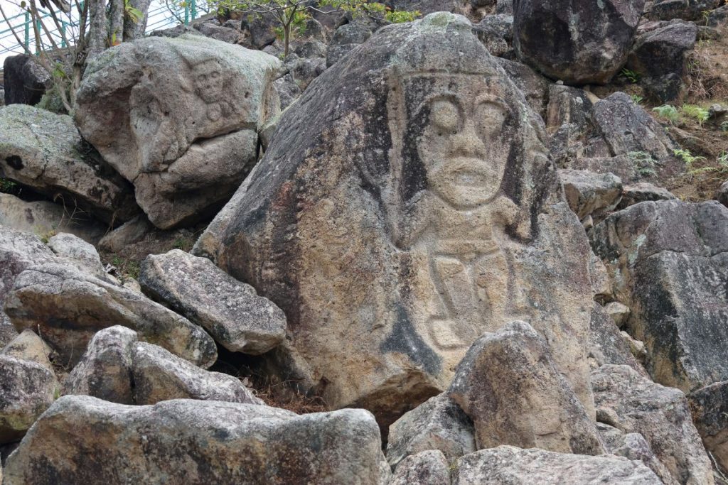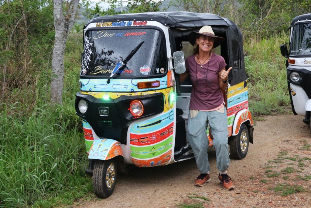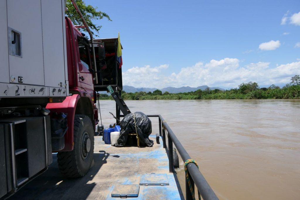 Eine schöne Tour von 17 km und 600 Höhenmetern bewältigen wir in 3 ½ Stunden, um die farbigen Wächter in El Purutal zu besichtigen. Tatsächlich ist die Naturfarbe der rot/ gelben Harze noch sichtbar und wurde erst in den 1980er Jahren offiziell entdeckt. Die Statuen sind mit einem Dach großzügig geschützt und die an ihnen haftenden rot, gelb, weiß und schwarzen Farbreste mögen hoffentlich noch viele weitere Jahrzehnte an ihnen haften bleiben. Die Sonne meint es heute gut mit uns und verwöhnt uns nach dem gestrigen Regentag. Wir laufen weiter zum La Chaquira Aussichtspunkt und müssen so manch tiefmatschigen Weg bezwingen. Von hier können wir die in rohe Steinbrocken gemeißelte Reliefs bewundern. Ein Mann mit Federkrone, der Jaguarschaman und eine Frau. Es wird vermutet, dass es sich hierbei um die Darstellung eines Sonnenkultes handelt. Ein angelegter Treppenweg führt uns auf Aussichtsplattformen mit einem fantastischen Blick auf die Schlucht des Rio Magdalena. Wir kommen genau rechtzeitig in unserer Emma an, bevor ein extremer Regenguss niedergeht. Nun ist die Wiese von Pablo mit Pfützen durchtränkt.