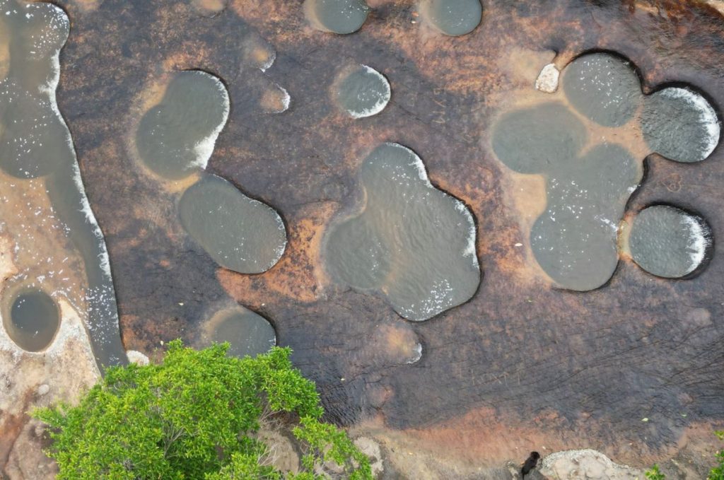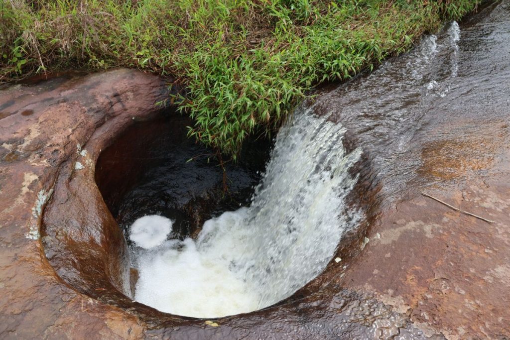 Das Bild des durchlöcherten rötlichen Gestein des Flussbetts über den das Wasser fließt ist einmalig. Auch das Wetter wendet sich noch zu seiner besten Laune, der angekündigte Regen lässt auf sich warten und die Sonne blitzt hindurch.