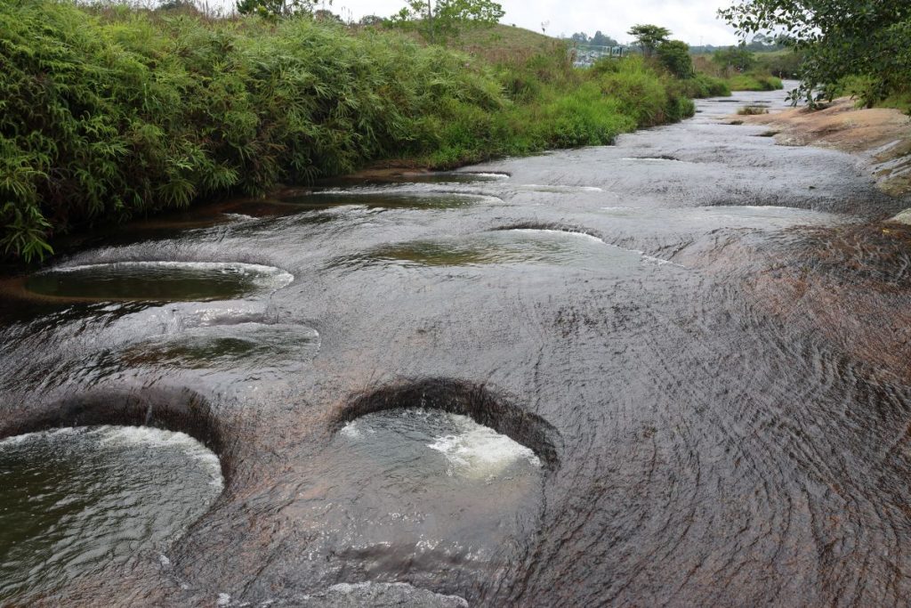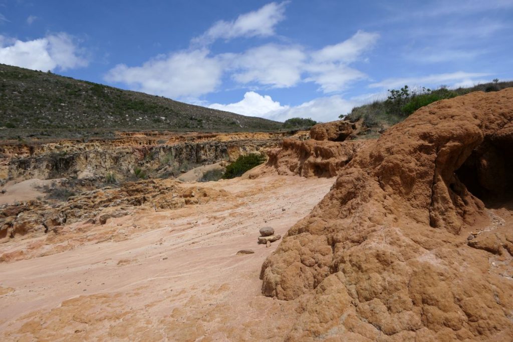 Dann geht es los auf dem mühevoll angelegten Wanderweg. Menschen auf Pferden begegnen uns und der morgendliche Frieden der Landschaft streichelt unsere Seele. Eine sehr interessante und Jahrtausendalte Naturerscheinung erwartet uns. Geologen erklären sich dieses Phänomen durch verstärkte vulkanische Aktivitäten und durch die tektonische Plattenverschiebung innerhalb des nördlich gelegenen Canyons Chicamocha. Wir staunen nicht schlecht und erkunden vorsichtig und strümpfig das Flussbett, wohl bedacht die reichlichen Löcher zu umgehen.