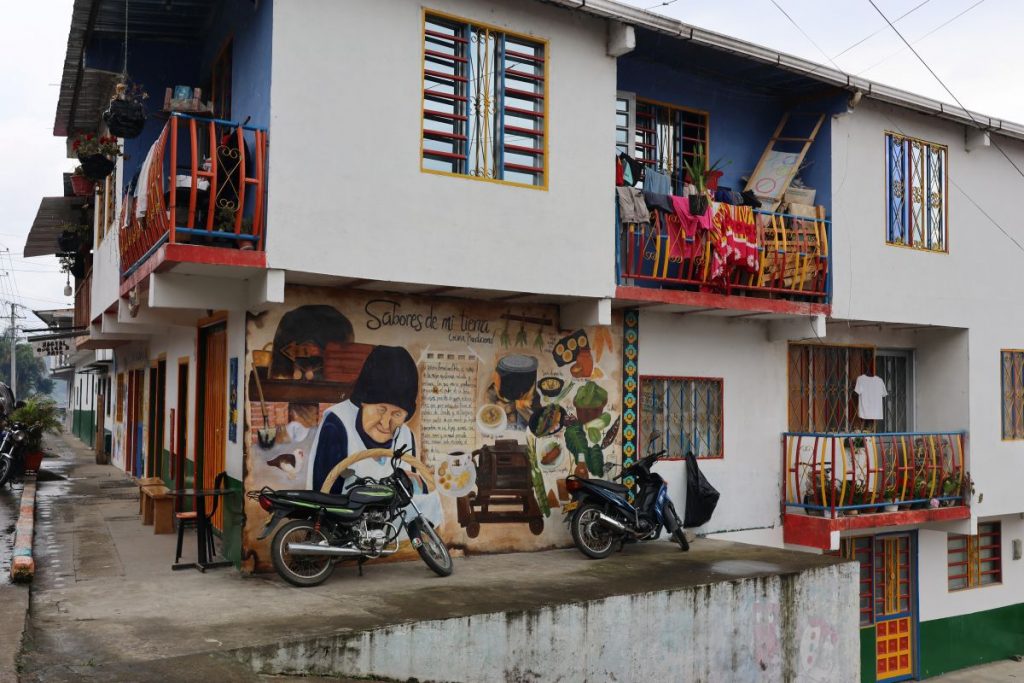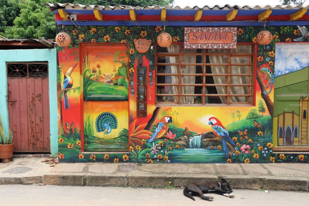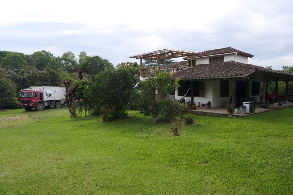 Doch die farbenintensiven Häuser und Dekorationen weckt gute Laune und wir staunen über diesen Ort. Beim Restaurant und Camping La Molino können wir auf der Wiese hinter dem Haus stehen, die bald vom Starkregen durchtränkt ist. Unsere Emma hat mal wieder auf dem weichen Untergrund ihre Spuren hinterlassen. Ja, wir sind nun in der Regenzeit und gegen Nachmittag und Abend kann es extreme Wassermengen herunterschütten. Nun zeigt sich mit aller Macht, dass Kolumbien das regenreichste Land der Welt ist.