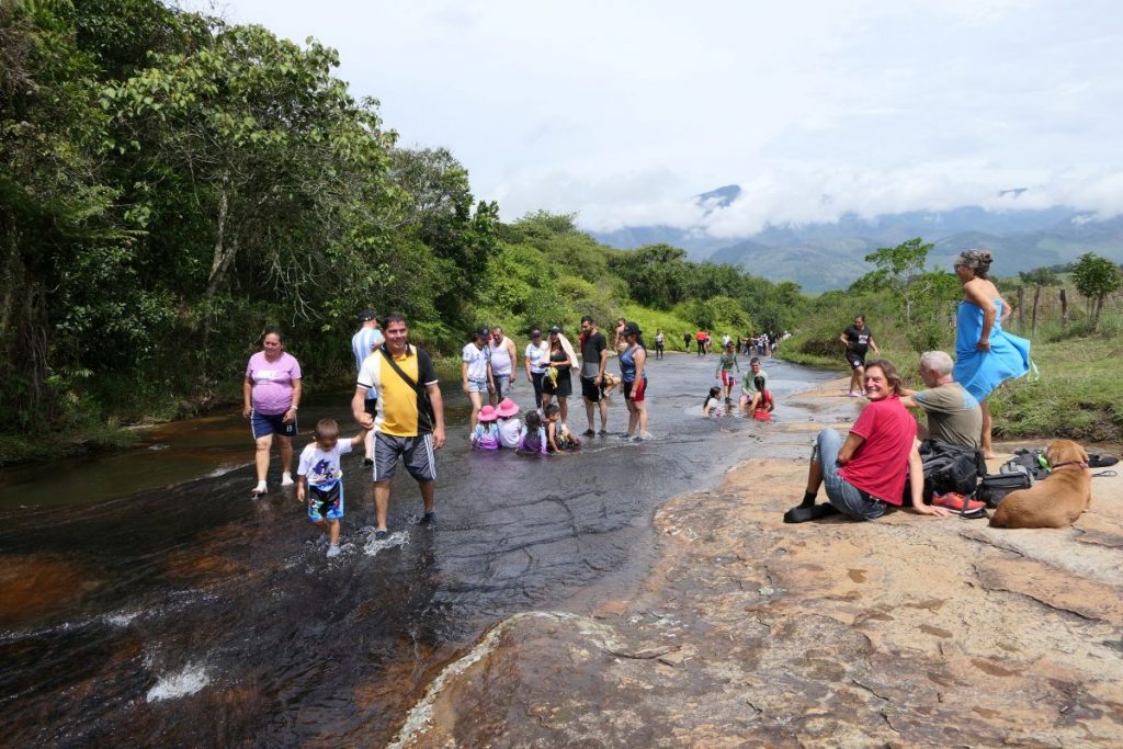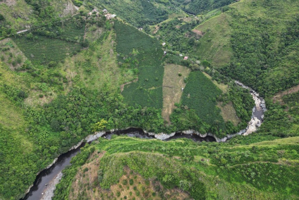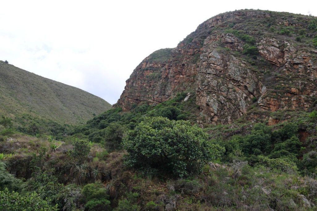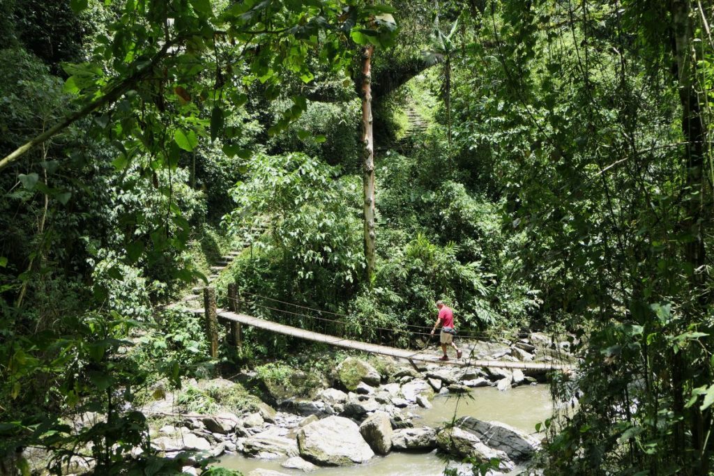 Am nächsten Morgen wandern wir schon sehr früh los auf dem Sendero Las Gachas zur Seele Kolumbiens, eingebettet in die sattgrüne, hügelige Landschaft mit einem sagenhaften Blick auf die Andenkordilleren. Wir besuchen die natürlichen Wasserlöcher in einem roten durch Eisenoxide gefärbten Felsen-Bachbett. Rafael gibt uns noch den Tipp, ein zweites Paar Socken mitzunehmen, denn mit ihnen kann man auf dem Bachbett gut laufen. Barfüßig würden wir ausrutschen und vielleicht sogar in die 4-6 m tiefen Löcher fallen.