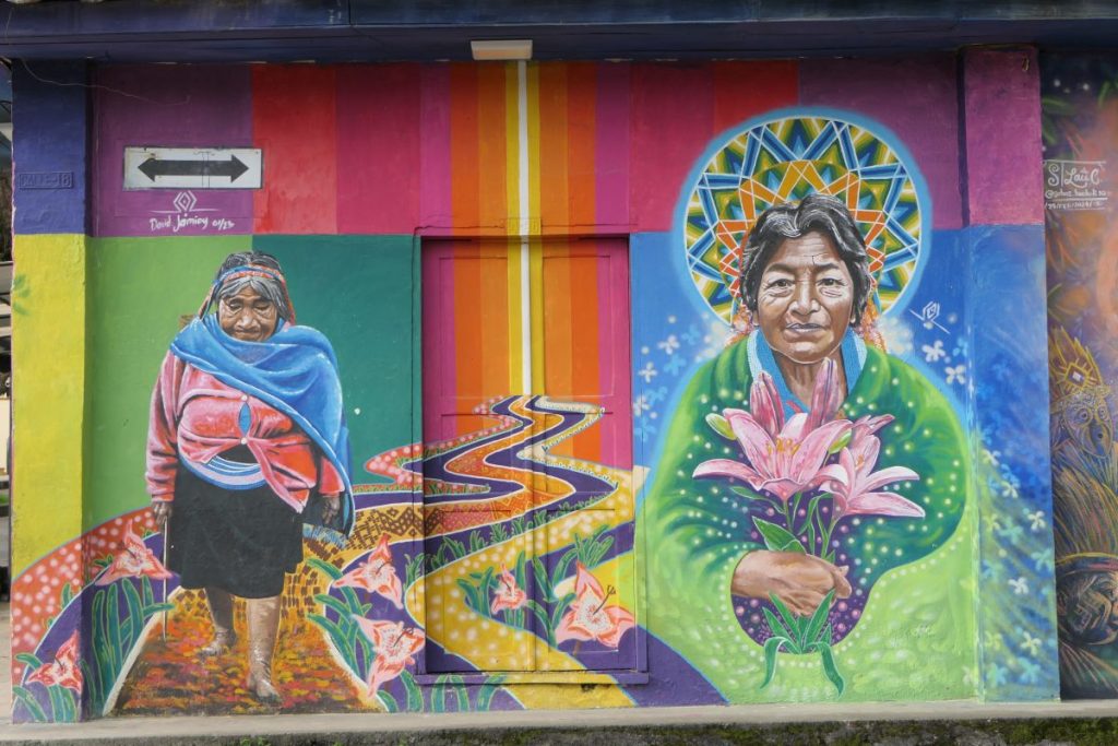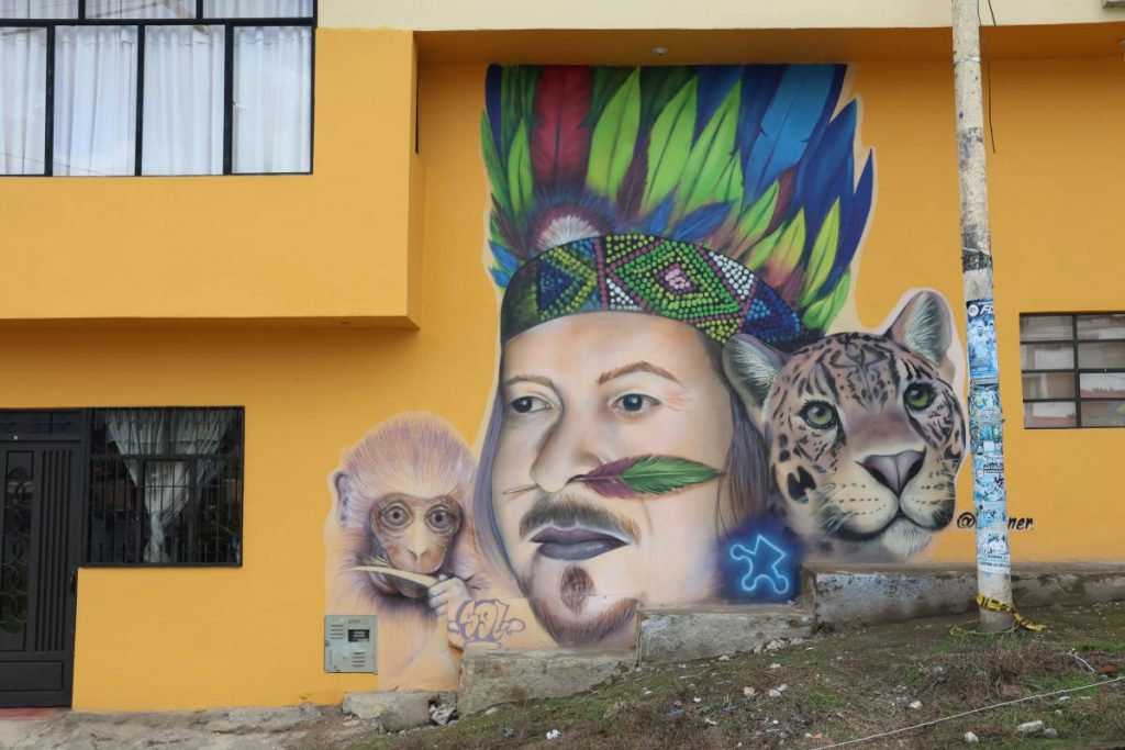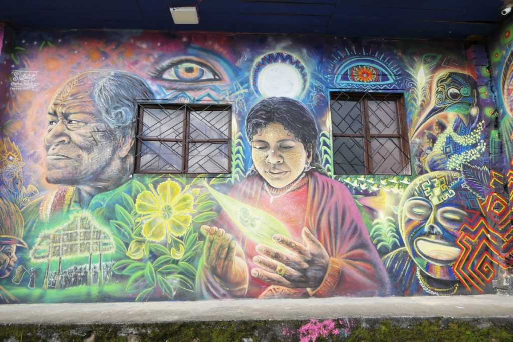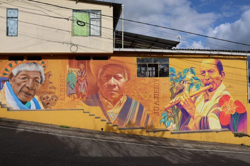 Nach 5 Stunden für 80 km kommen wir in Sibundoy auf 2150m Höhe an. Es ist ein Inka-Dorf und besteht seit 1492. Nun wird es von den Nachfahren der modernen Inga bewohnt. Der Ort ist mit schönen Murals und Holzschnitzereien im Park, welche die Inka- Mythologie und Tradition wiedergeben, geprägt. Wir stehen exponiert auf dem Platz vor der Kirche. Einige Einheimische interessieren sich für uns und Emma und sie sind alle sehr freundlich und wohlwollend. Der Platz füllt sich vor der Kirche und in der Kirche. Wir befinden uns mittendrin und dürfen das bunte Miteinander erleben.