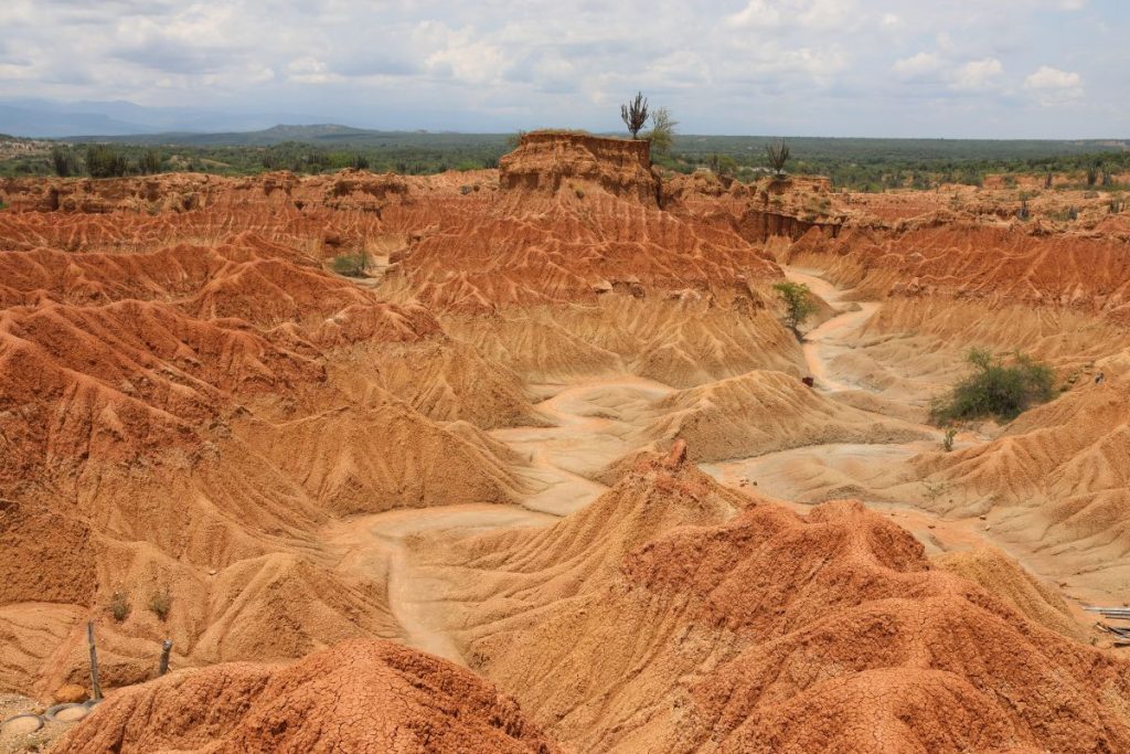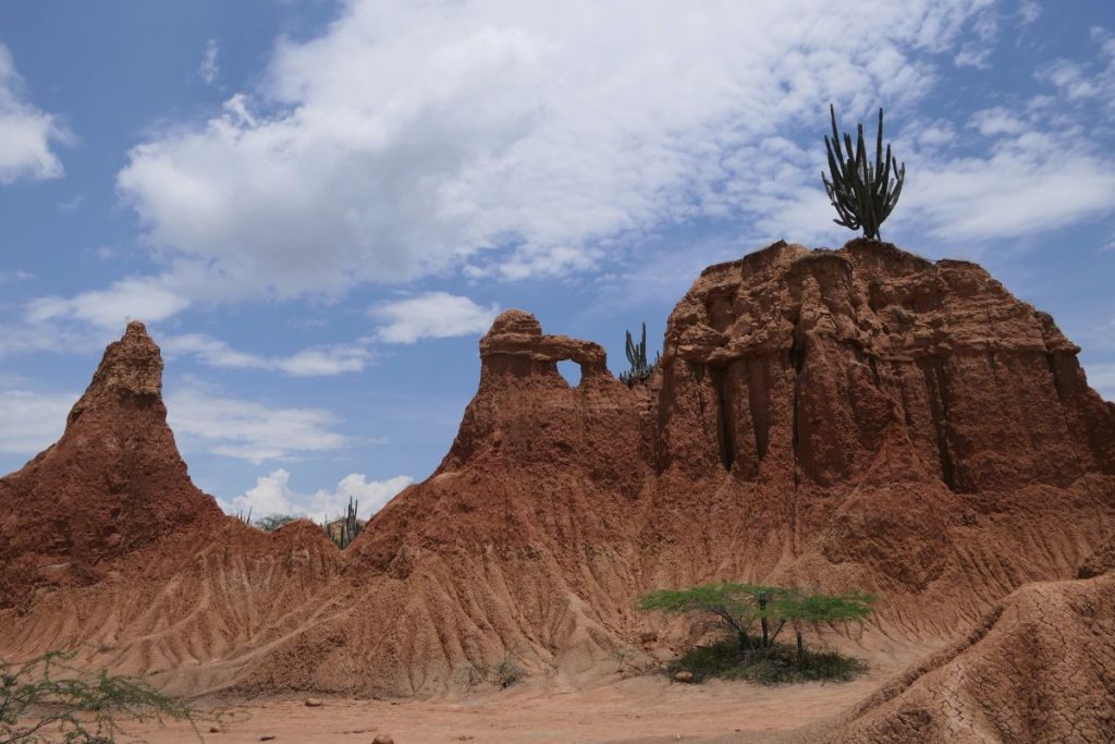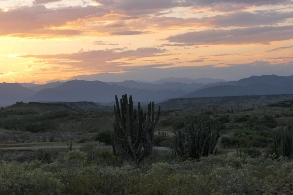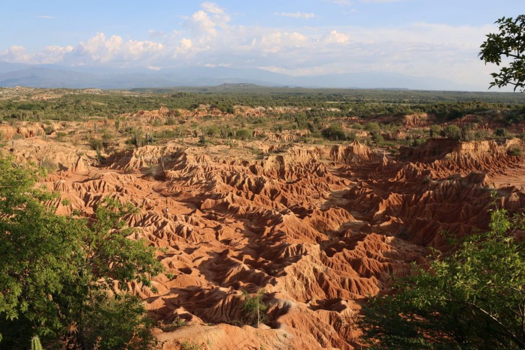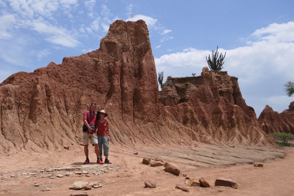 Vor 5 Millionen Jahren befand sich hier ein Sumpfwald oder Meer, übrig gebliebene versteinerte Überreste von Tieren die wir im Museum begutachten konnten. Nun stehen wir in einer rot, Ocker und graugefärbten Wüste, was ebenso zu den Anden gehört. Könnt ihr euch vorstellen, dass es eine Wüste in den Anden gibt? Beeindruckende 7500 km ziehen sich die Anden als längstes und abwechslungsreichstes Gebirge durch Südamerika. Wir werden von der niederschlagsarmen Wüste bis zum ewigen Eis und Schnee der Sechstausender auch riesige Hochebenen und brodelnde Vulkane finden. Und hier die große Tatacoa -Wüste „Desierto de la Tatacoa“, die von den Indigenen Klapperschlange genannt wird, gehört zum trockenen Andenteil auf 430m Höhe. Es fällt nur vereinzelt Regen, 1000 mm pro Jahr mit einer Durchschnittstemperatur von 28 Grad.