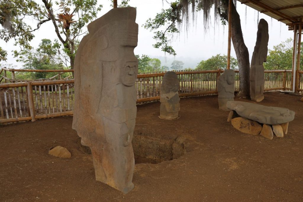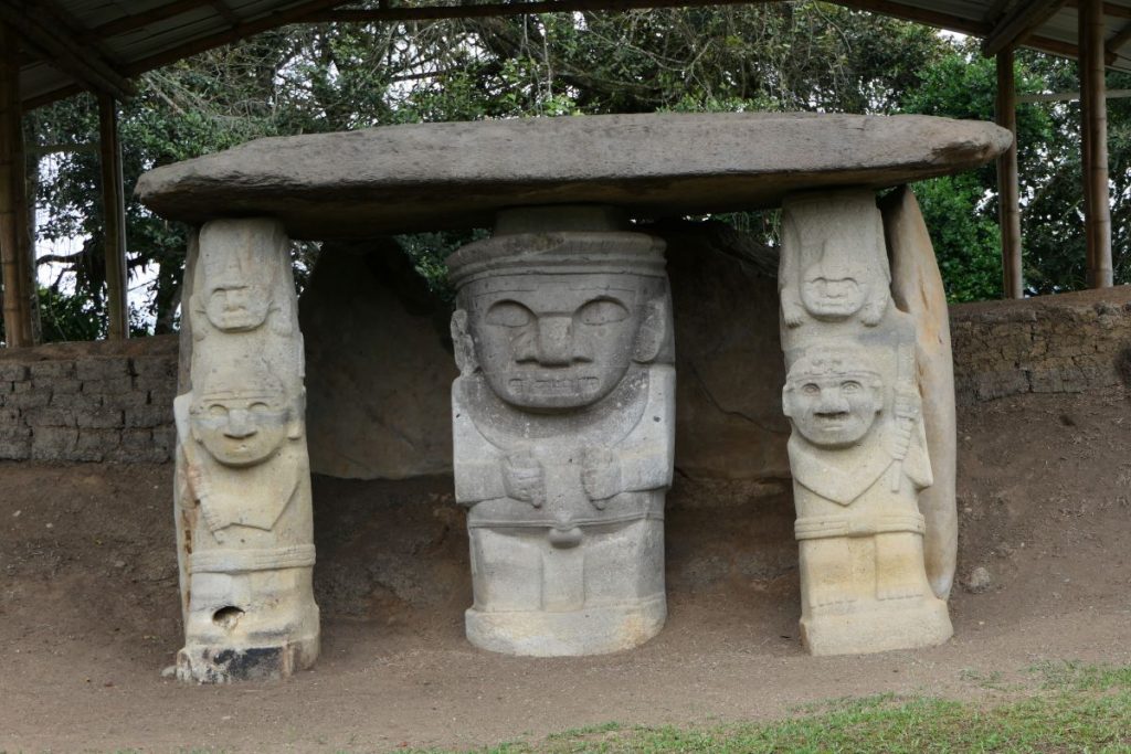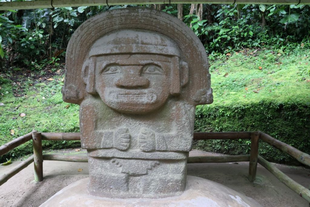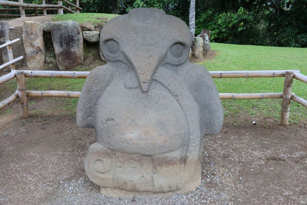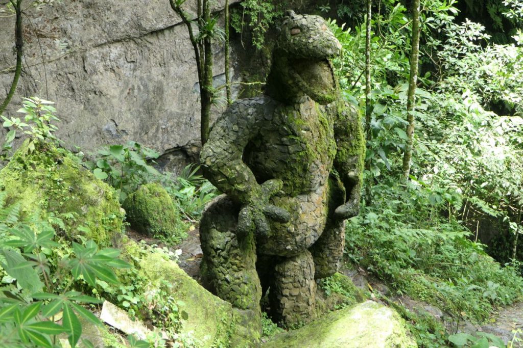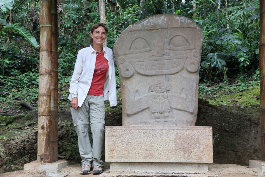 Was finden wir hier in diesen grünen Hügeln? 5000 Jahre Geschichte, denn hier bestand in präkolumbische Zeit eine Zivilisation, die San Agustin als Zeremonienstätte nutzte und mindestens 300 teilweise riesige aus Lavastein und Basalt gehauene Statuen sowie Grabanlagen und Erdwälle schuf. Der Archäologische Park ist herrlich angelegt. Auf bemoosten feuchten mit runden Kieseln gelegte Steinwegen gelangen wir durch einen sekundären Regenwald zu verschiedenen Mesitas, Plätze mit Gräbern, Grabhügeln und Wächtern davor, Schamanen, die beeindruckenden Skulpturen „El Obispo“ (Bischof) ein Uhu der eine Schlange um krallt (Machtsymbol?) sowie ein Dreieckiger Kopf mit Blick in den Osten. Die Grabstätten wurden so errichtet, dass sie vor Blicken verborgen blieben. Es benötigte sicher viel Zeit und viele Personen um die Steine zu sammeln, zum Standort zu transportieren und Statuen zu behauen. Diese Grabstätten wurden später mit Erde bedeckt, wodurch kleine Hügel entstanden und von Vegetation verdeckt wurden.
