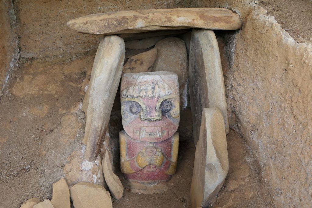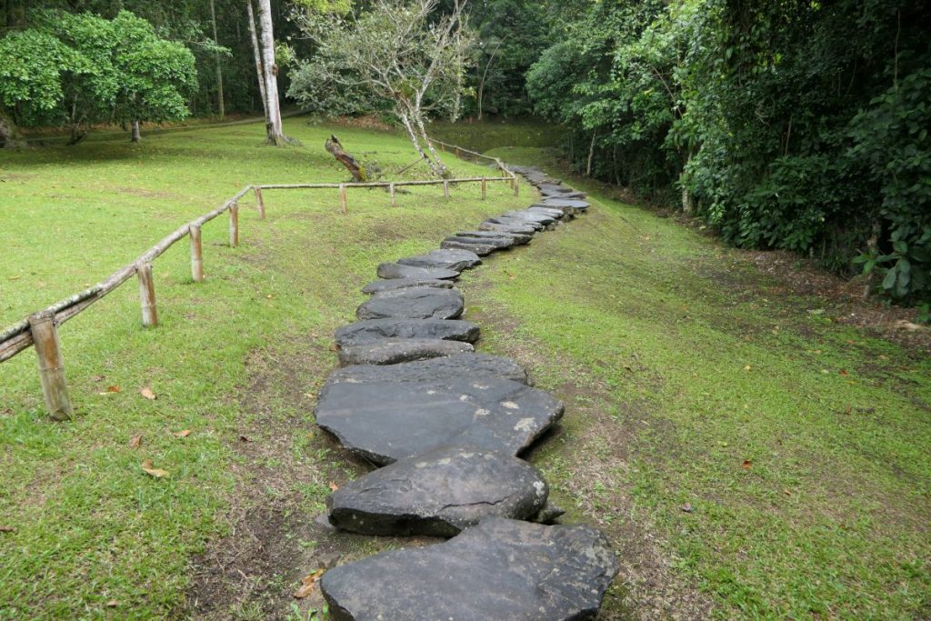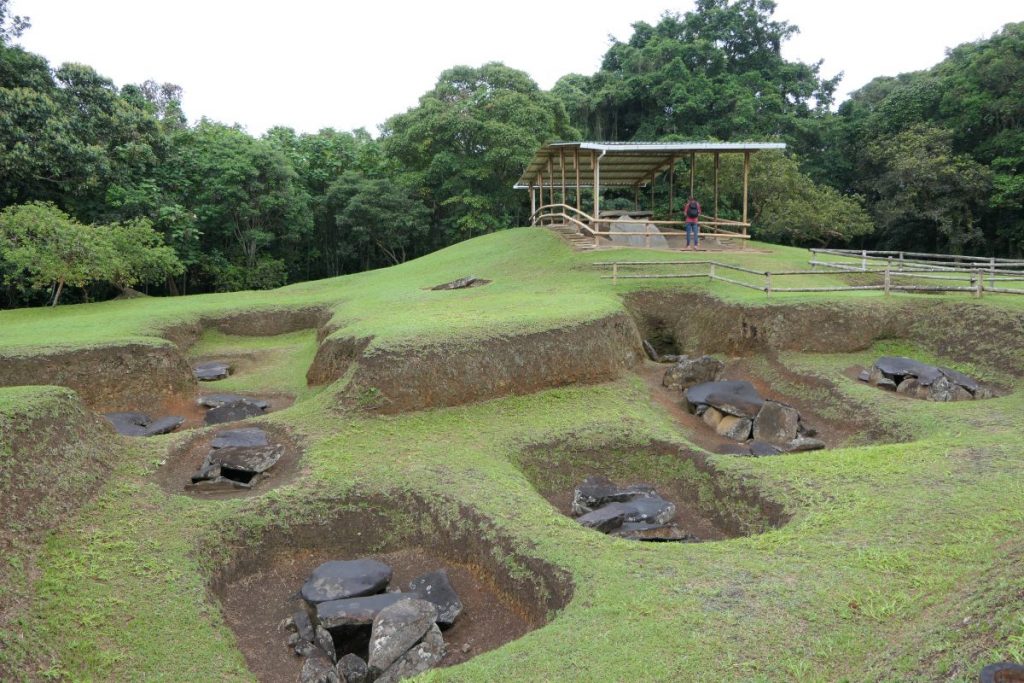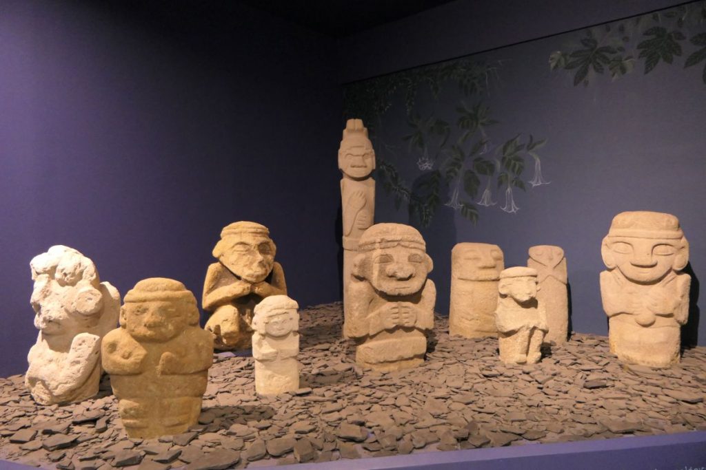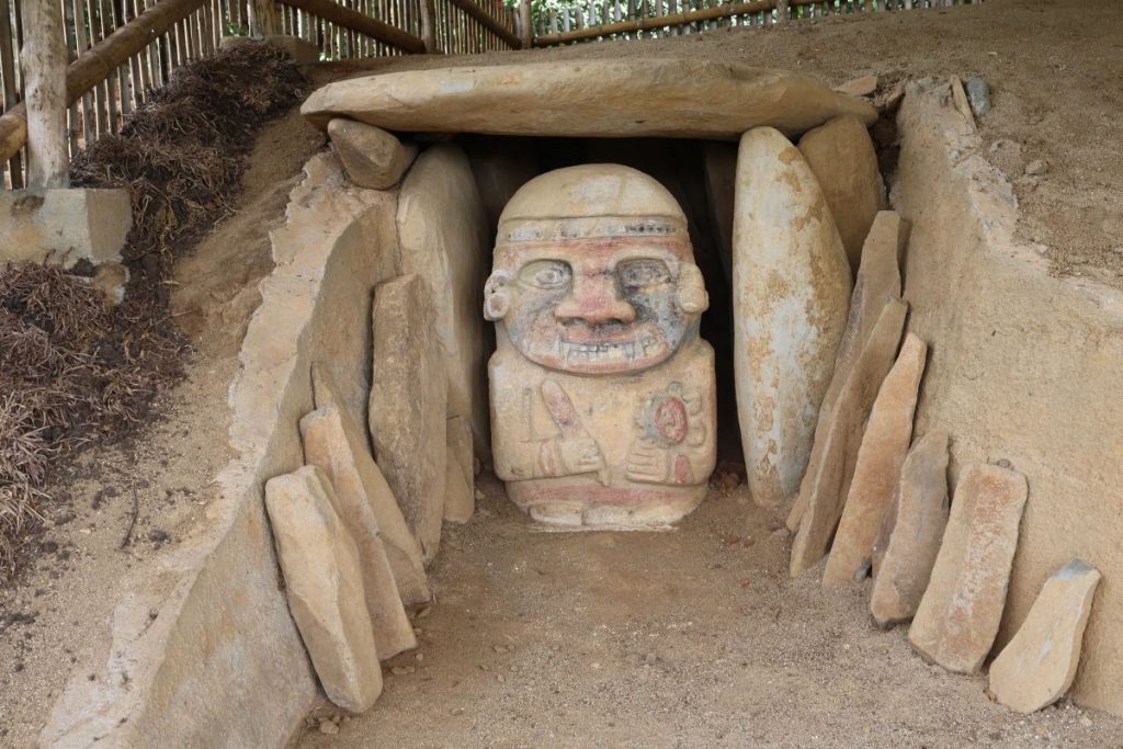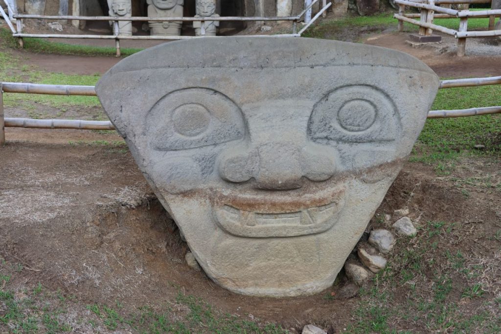 Was finden wir hier in diesen grünen Hügeln? 5000 Jahre Geschichte, denn hier bestand in präkolumbische Zeit eine Zivilisation, die San Agustin als Zeremonienstätte nutzte und mindestens 300 teilweise riesige aus Lavastein und Basalt gehauene Statuen sowie Grabanlagen und Erdwälle schuf. Der Archäologische Park ist herrlich angelegt. Auf bemoosten feuchten mit runden Kieseln gelegte Steinwegen gelangen wir durch einen sekundären Regenwald zu verschiedenen Mesitas, Plätze mit Gräbern, Grabhügeln und Wächtern davor, Schamanen, die beeindruckenden Skulpturen „El Obispo“ (Bischof) ein Uhu der eine Schlange um krallt (Machtsymbol?) sowie ein Dreieckiger Kopf mit Blick in den Osten. Die Grabstätten wurden so errichtet, dass sie vor Blicken verborgen blieben. Es benötigte sicher viel Zeit und viele Personen um die Steine zu sammeln, zum Standort zu transportieren und Statuen zu behauen. Diese Grabstätten wurden später mit Erde bedeckt, wodurch kleine Hügel entstanden und von Vegetation verdeckt wurden.