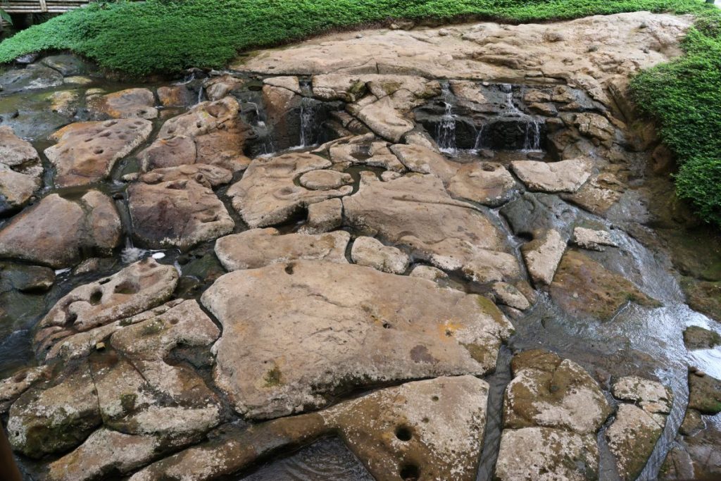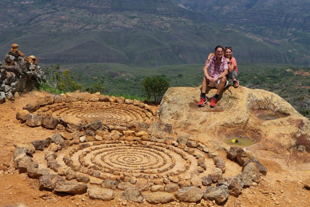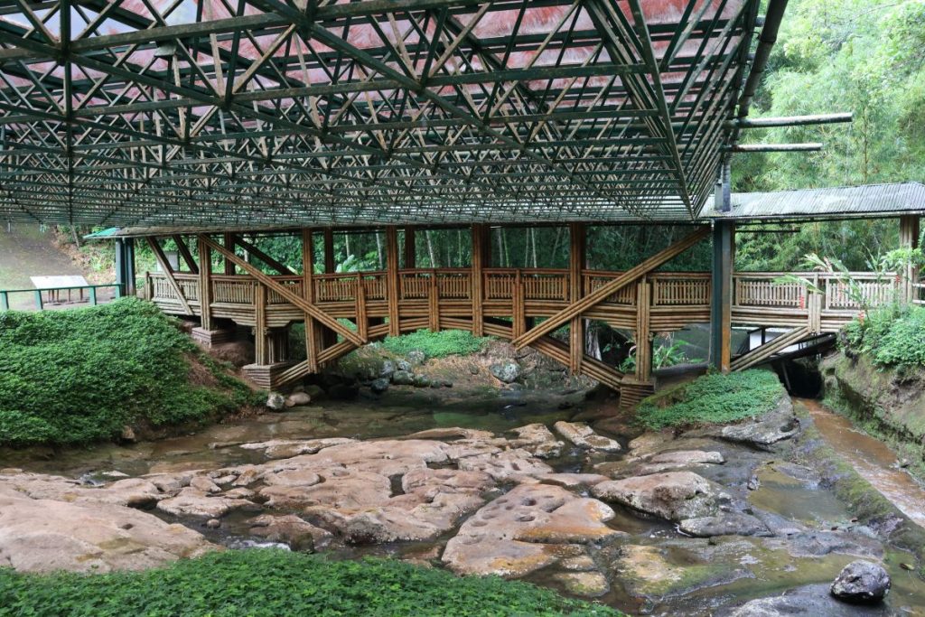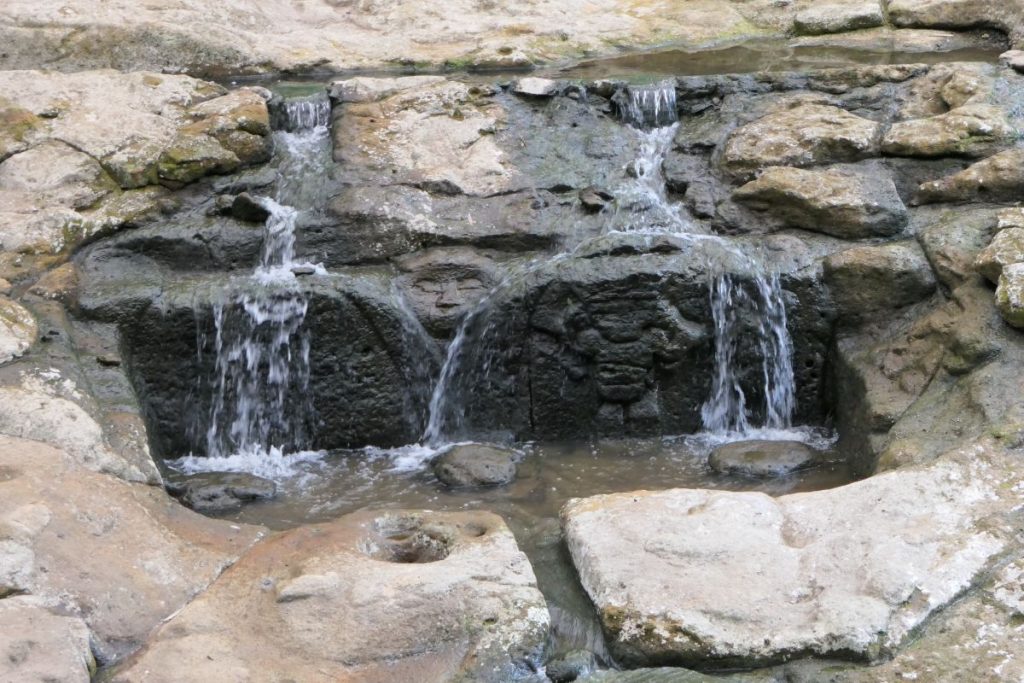 Wir gehen durch den knarrenden Bambuswald in ein Tal zur „Fuente Ceremonial de Lavapatas“. Dieser Platz hat für uns eine besondere Ausstrahlung. Das felsige Flussbett verbreitert sich hier und in das Gestein sind Rinnen, Abbildungen von Tieren wie Schlangen eingemeißelt. Es erinnert uns an eine Landkarte und wird mit dem darüber fließenden Wasser mit Leben und Bewegung erfüllt. Von der überdachten Bambusbrücke haben wir den besten Blick, auch auf einen gefiederten Freund Mormot (hihi) und genießen die kurze Regenpause.