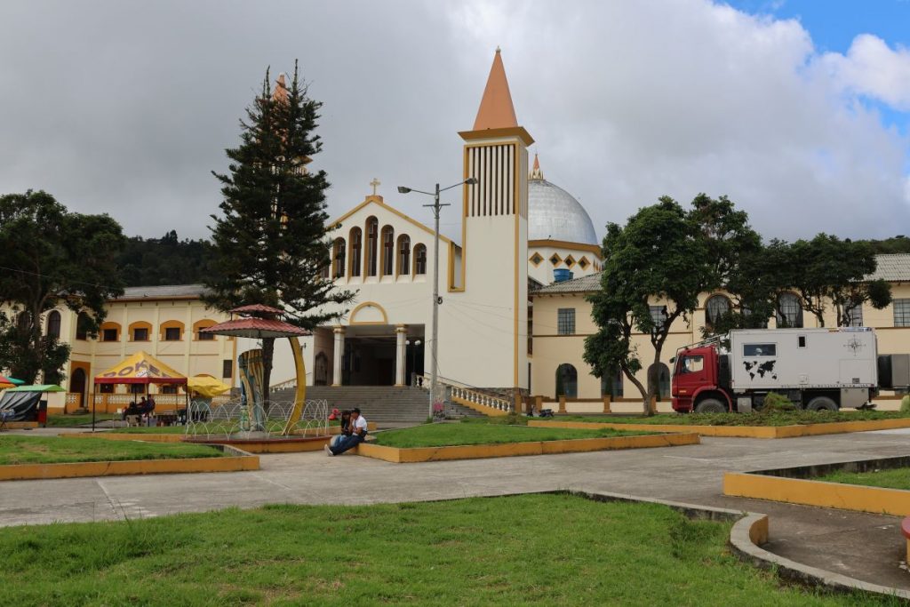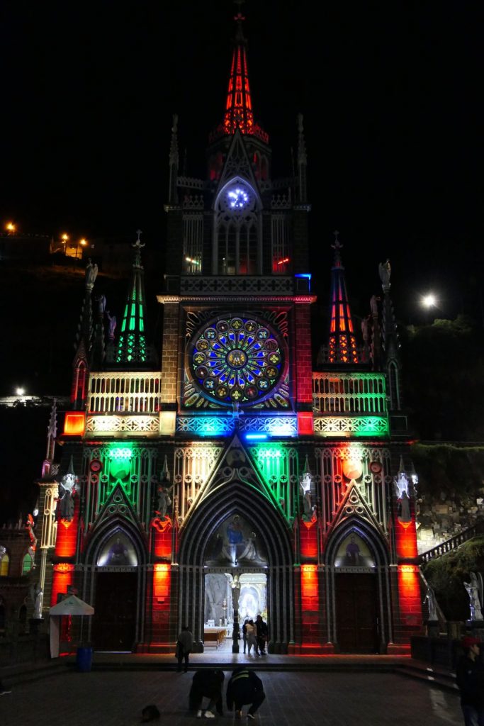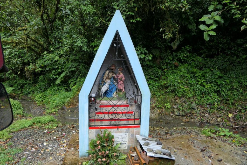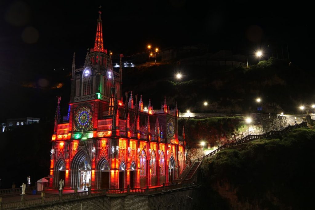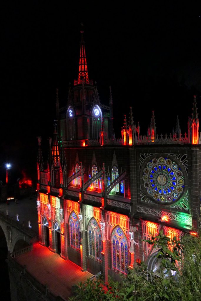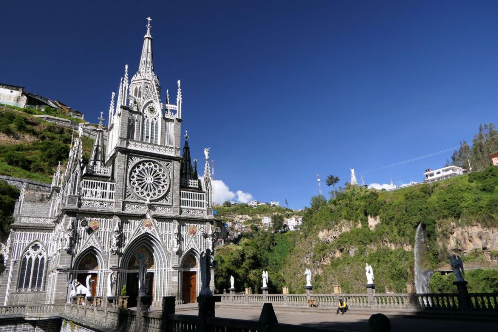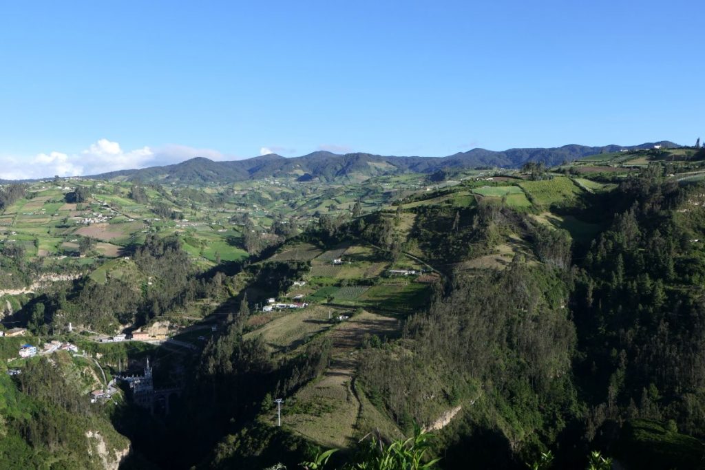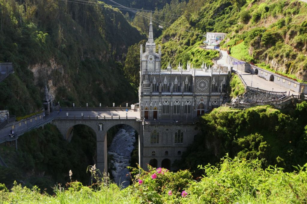 Unser letztes Ziel 10 km vor der ecuadorianischen Grenze ist das Santuario de Nuestra de Las Lajas „Wallfahrtsstätte Unserer Lieben Frau von Las Lajas“. Wir können an der Telegrafico de Las Lajas stehen und mit der modernen Gondel in das 350m tiefere Tal und in die Schlucht gleiten.