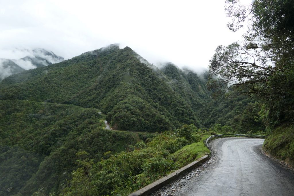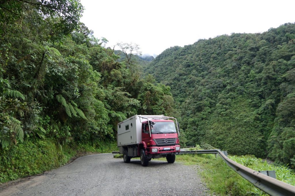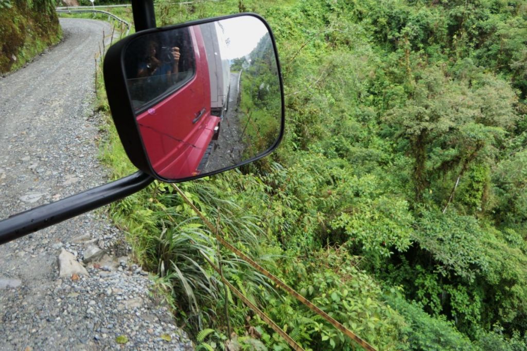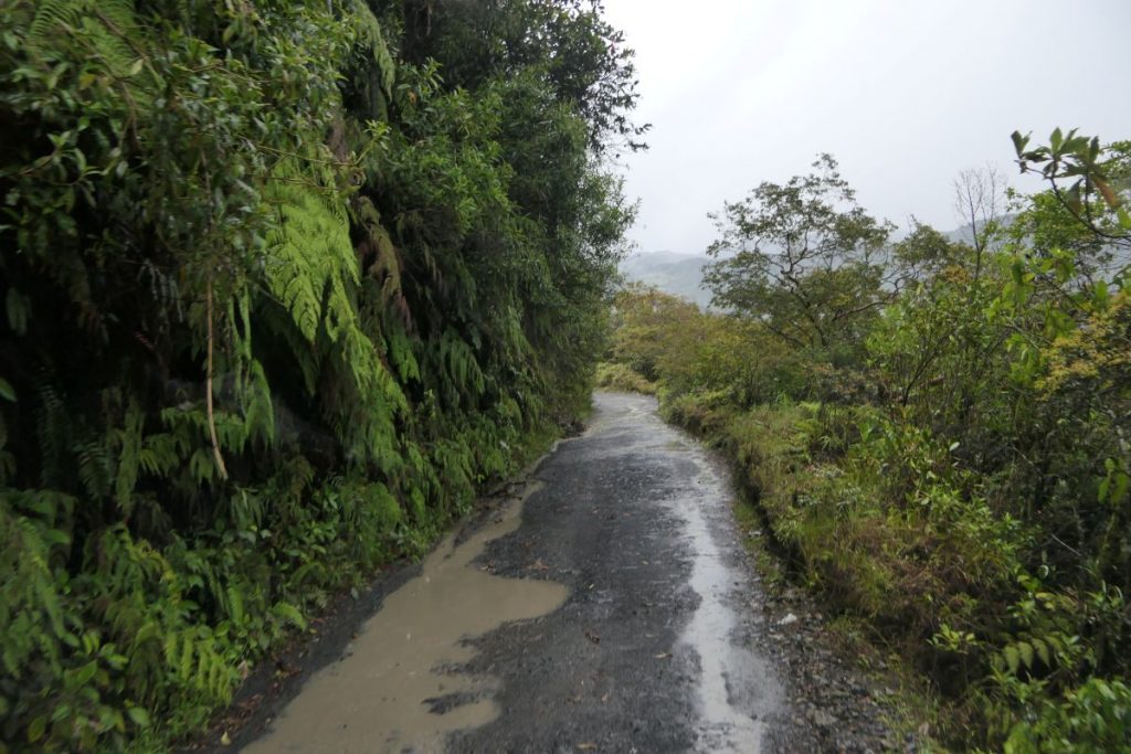 Es wird nicht so heiß gegessen wie gekocht. Es wird auch kein Todessprung oder ähnliches, doch dass es auf einer einspurigen 3m breiten Piste mit Gegenverkehr eng wird, damit rechnen wir. Mit dem Wetter haben wir mehr Glück als erwartet und das in der Regenzeit. Wir haben zwar Wolken und hin und wieder Nieselregen doch wir haben herrliche Ausblicke auf grün, grün und nochmals grün. Durch die Regenfälle gibt es oft Erdrutsche und Straßenkanten brechen weg. Doch die Strecke ist gut geschottert und mit Leitplanken und provisorischen Absperrungen gesichert. An manchen Stellen ist der Weg so schmal, dass auch die Stöckchen mit den gelben Absperrbändern nichts nützen würden.