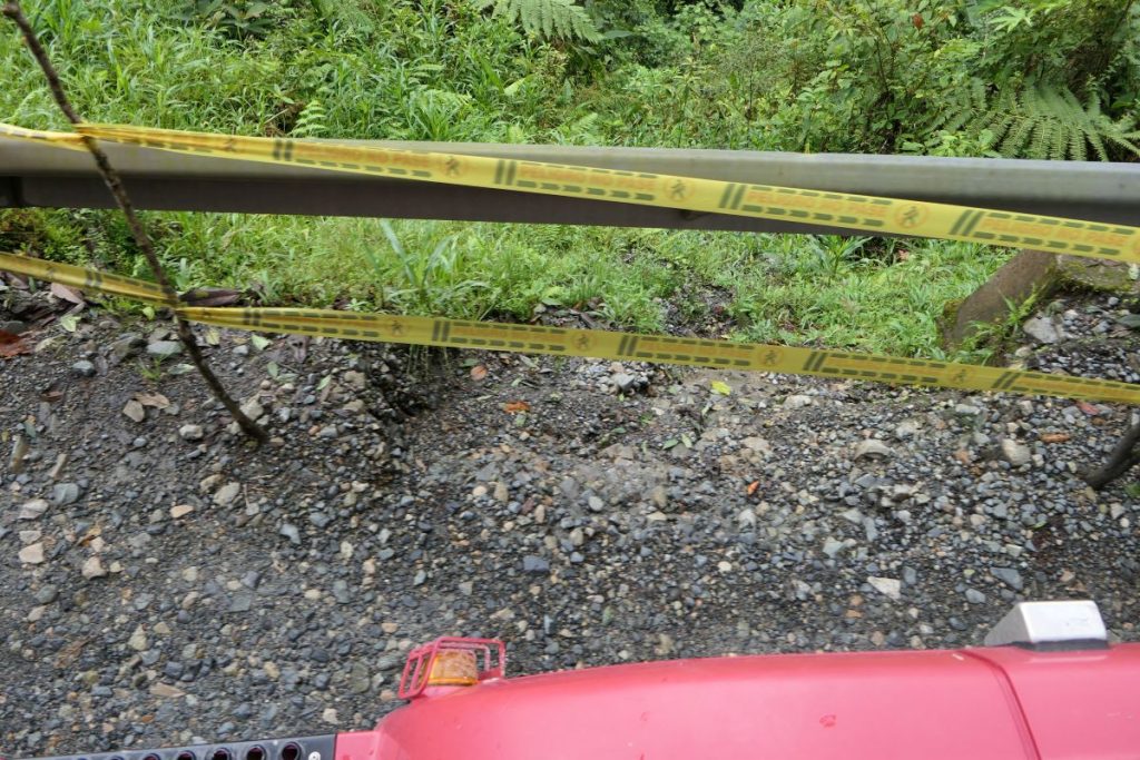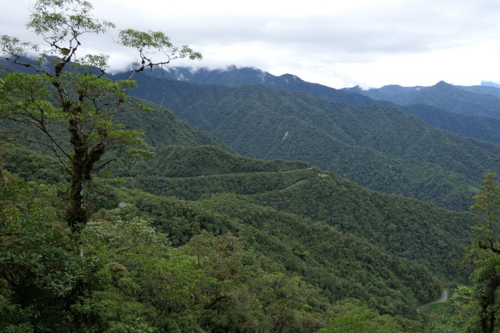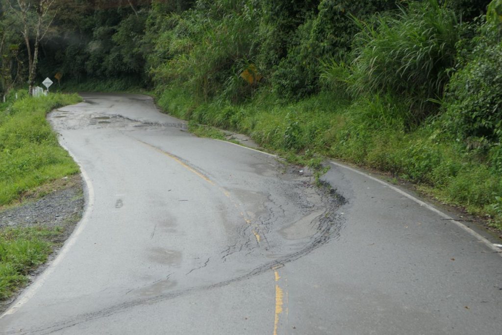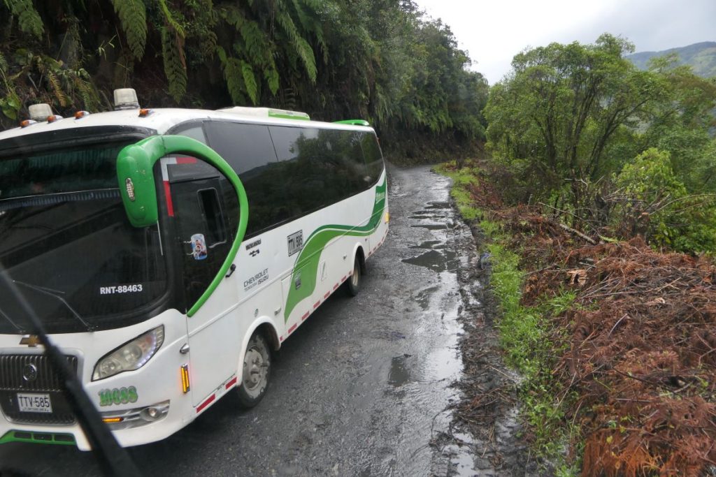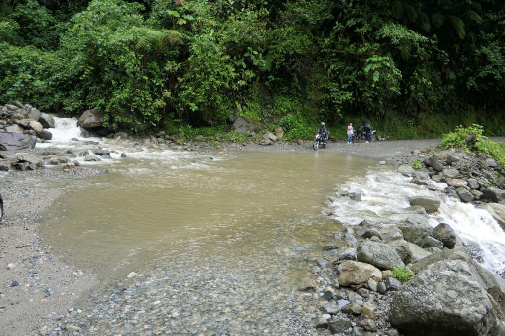 Es wird nicht so heiß gegessen wie gekocht. Es wird auch kein Todessprung oder ähnliches, doch dass es auf einer einspurigen 3m breiten Piste mit Gegenverkehr eng wird, damit rechnen wir. Mit dem Wetter haben wir mehr Glück als erwartet und das in der Regenzeit. Wir haben zwar Wolken und hin und wieder Nieselregen doch wir haben herrliche Ausblicke auf grün, grün und nochmals grün. Durch die Regenfälle gibt es oft Erdrutsche und Straßenkanten brechen weg. Doch die Strecke ist gut geschottert und mit Leitplanken und provisorischen Absperrungen gesichert. An manchen Stellen ist der Weg so schmal, dass auch die Stöckchen mit den gelben Absperrbändern nichts nützen würden.