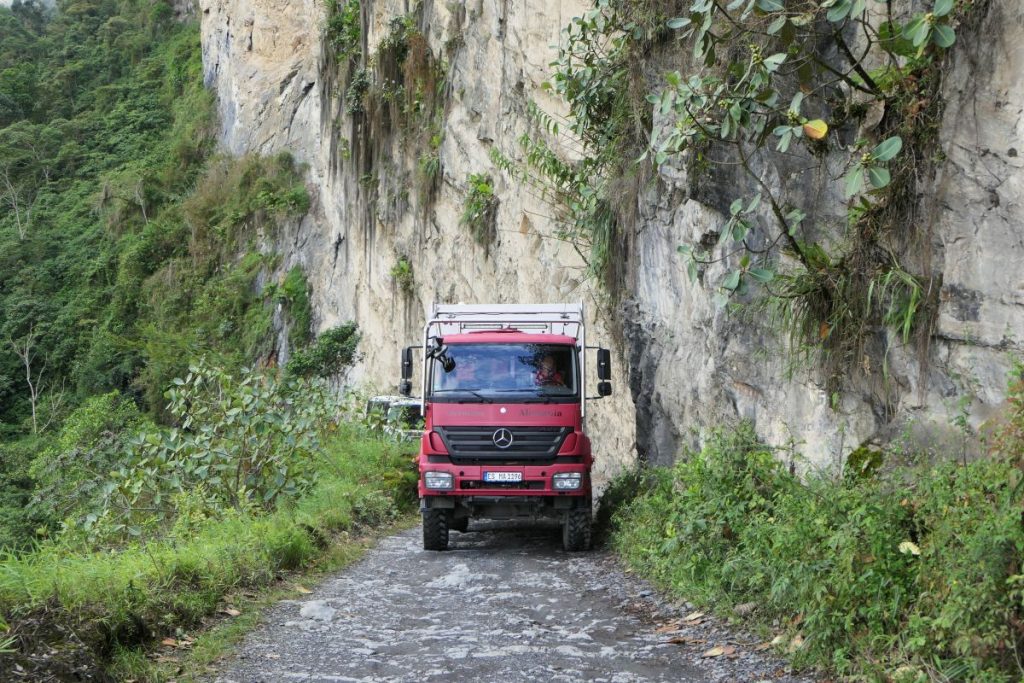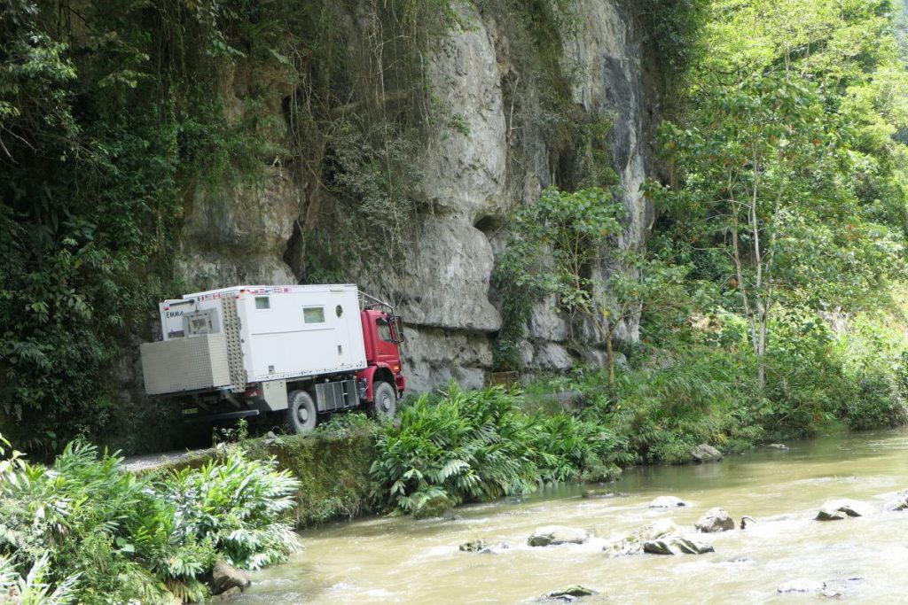 Der Weg hat sich gelohnt, und manchmal ist es einfach gut, wenn man nicht weiß, was auf einen zukommt. Wir wissen nun, was uns auf dem Rückweg erwartet und können uns darauf einstellen. Zum Glück gehe ich nach ein paar Kilometern meinem komischen Bauchgefühl nach und schaue mal hinten in unsere Wohnkabine. Tatsächlich hat sich ein Schloss unter der Spüle geöffnet und die Eimer sind hüpfend herausgewandert, zudem hat sich der Müllinhalt verteilt. Doch es hätte schlimmer enden können, wenn der Eimer mit unseren Vorrats- Flaschentomaten gekippt wäre. Also wieder mal „Schwein“ gehabt oder auch eine gute Intuition. Die Strecke führt an einer verengenden Felswand entlang, die mit dem Abgrund auf der anderen Seite eine große Herausforderung darstellt. Nun bei Tageslicht erkennen wir erst die Fahrleistung, die bei der Hinfahrt im Dunkeln gemeistert wurde. Respekt an Andy, dass Emma ohne Schrammen durchkam !!!