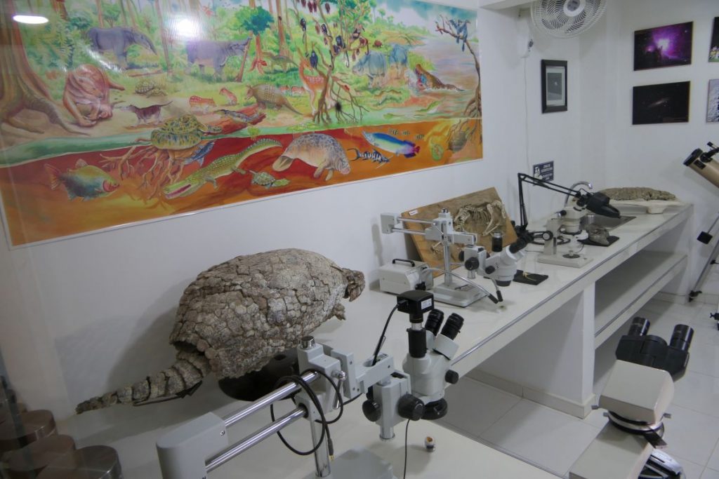 Zur Tatacoa- Wüste gibt es kurz nach La Palmita eine Abkürzung von 80 km, doch es geht dabei über einen Fluss mit einer Fähre und es ist fast ausschließlich Piste. Wir entscheiden uns dafür, denn zwei Einheimische bestätigen uns, dass wir es mit Emma schaffen können. Auf der Strecke mit Reisfeldern und den schönen Anden kommen wir in La Victoria am Museo de Historia Natural de la Tatacoa vorbei. Hier, fast im „Nirgendwo“ interessiert uns dieses 2021 neu eröffnete Fossil Museum. Und es besitzt tatsächlich die größte Fossil Sammlung ganz Kolumbiens. Es wurde von einem amerikanischen Astronaut gesponsert und von einem Paar unterstützt, dass die Tatacoa Wüste ins Herz geschlossen hat. Auch der Guide ist Feuer und Flamme, sprüht vor stolz, weil sein Großvater und Bruder bei den Ausgrabungen mitgewirkt haben. Es ist ein Genuss, mit seiner Begeisterung durch die Mikroskope blicken zu können und das Farbenspiel der Mineralien zu entdecken, Fossilien anzufassen und die riesigen Millionen von Jahre alten versteinerten Tiere wie Kaimane, Riesengürteltiere und Riesenschildkröten zu betrachten. Wirklich sehenswert!