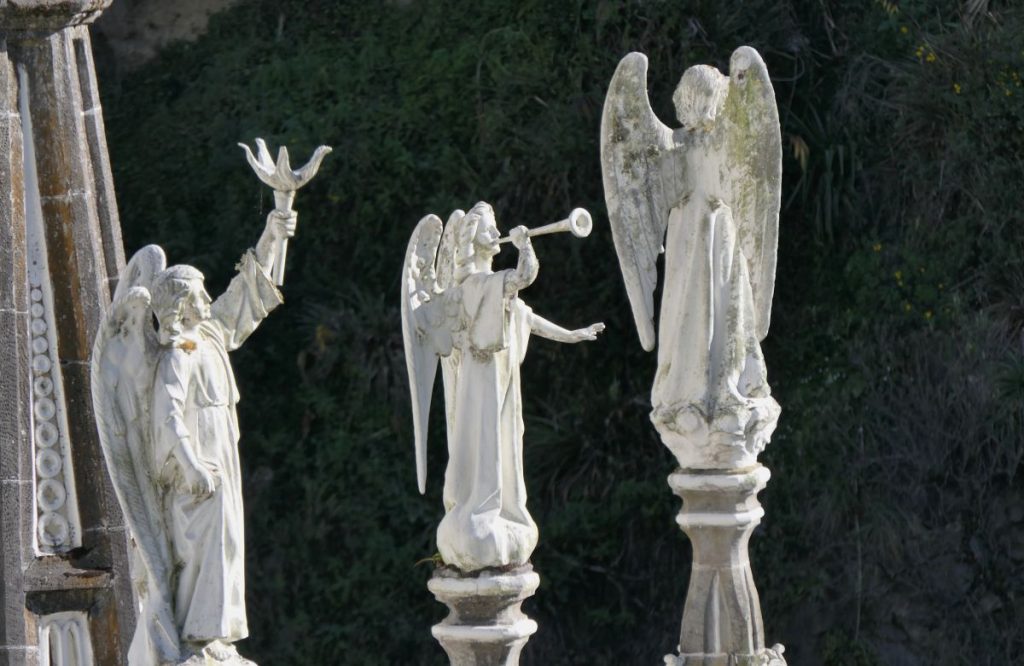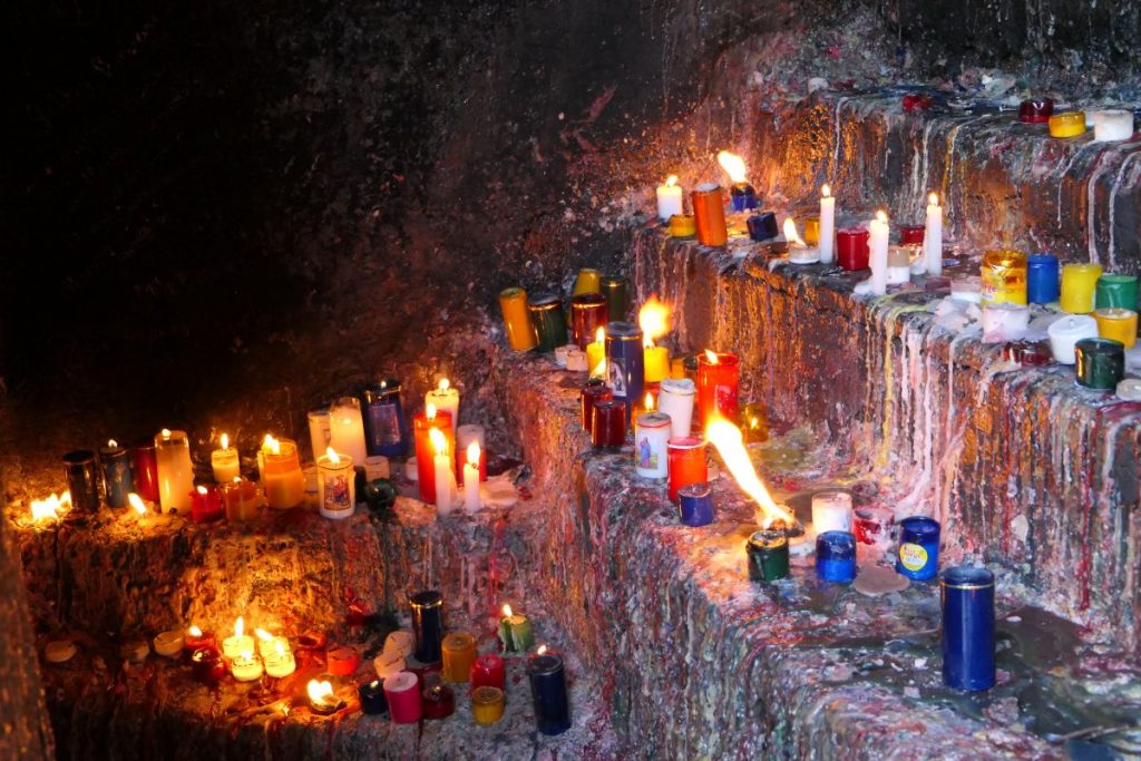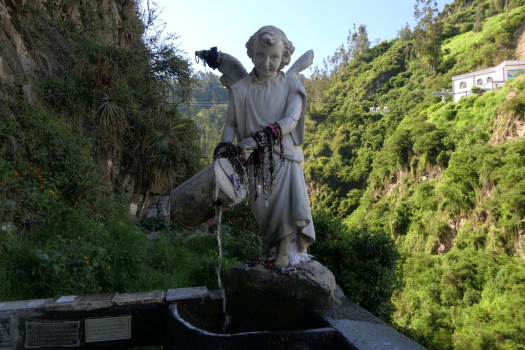 Wir sind sehr beeindruckt von diesen mächtigen Bögen, die sich über die Schlucht spannen und dem Anblick der Kirche die sich fast wie einem Fantasy- Film entflohen in die Schlucht schmiegt. Von Pilgern entzündete Kerzen, kleine Altare, musizierende Engel, ein Engelsbrunnen der heiliges Wasser spendet, sowie die Heilige Frau die mit ihrem Kind ganz in Gold erstrahlt, verleihen dem Platz einen märchenhaften Zauber.